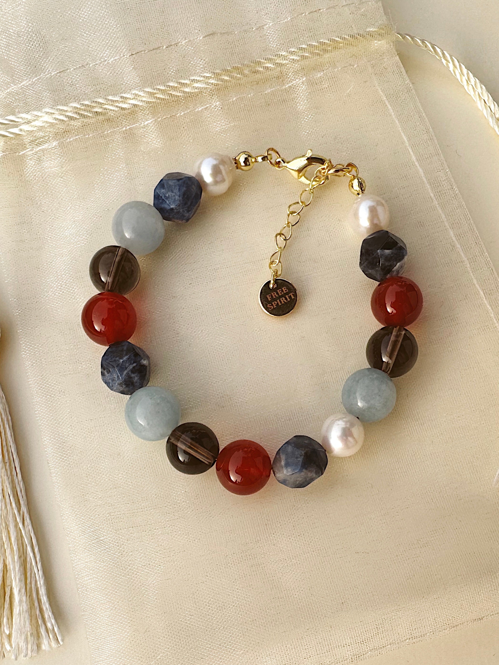 Regular price Dhs. 169.00Sale price Dhs. 169.00 Regular price Dhs. 200.00Unit price / perSoft sky-blue and golden shimmer in a bracelet that feels effortlessly elegant and modern.A gentle rhythm of calm and clarity flows through each bead, carrying a...