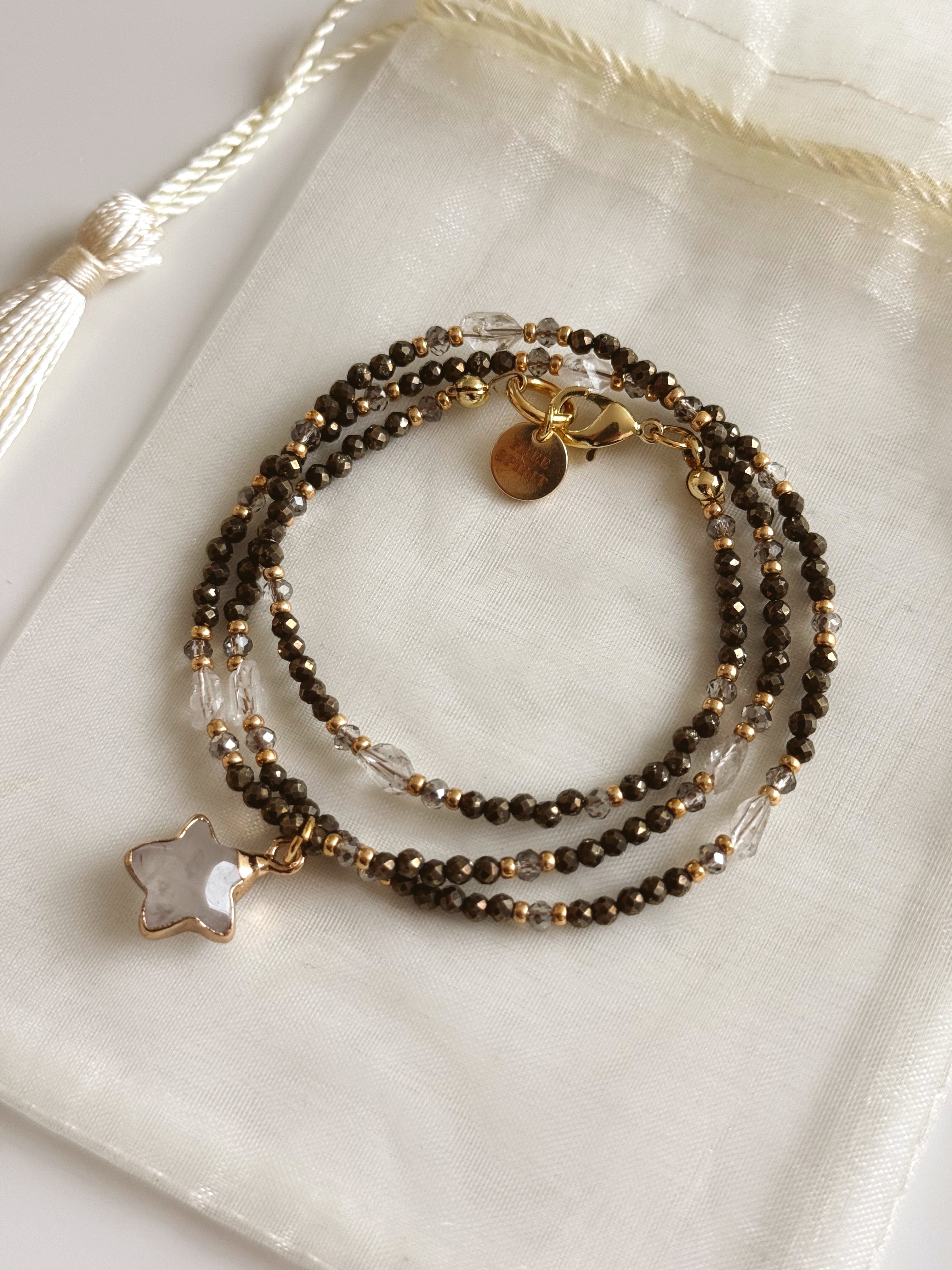 Regular price Dhs. 381.85Sale price Dhs. 381.85 Regular priceUnit price / perDesigned to wrap three times around the wrist, or sit as a delicate necklace, this piece blends quiet glamour with grounded energy. The dark metallic shimmer...