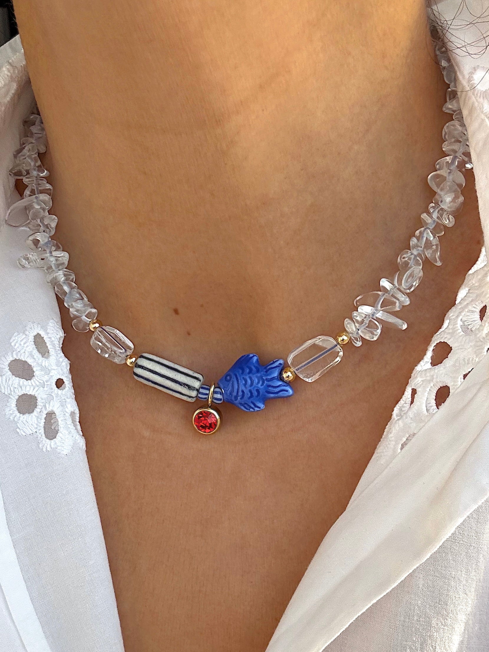 Regular price Dhs. 288.00Sale price Dhs. 288.00 Regular price Dhs. 364.82Unit price / perA necklace that refuses to whisper. Strands of clear quartz shimmer like fractured ice, while cobalt porcelain details bring an arty, nostalgic edge. At its heart,...
