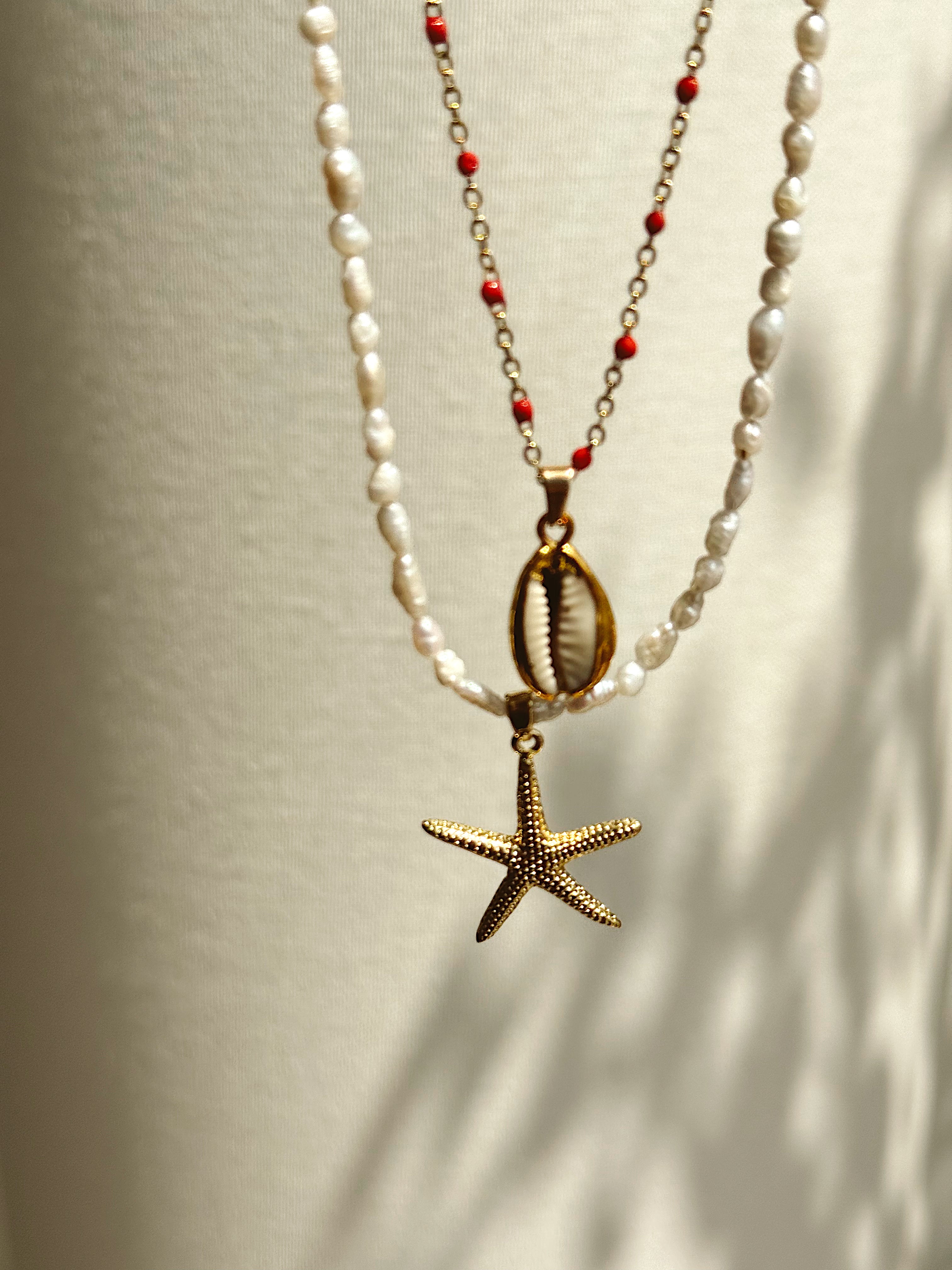 Regular price Dhs. 340.00Sale price Dhs. 340.00 Regular priceUnit price / perSoft pearls meet vibrant enamel in a duo that feels timeless yet bold. A starfish and a golden shell carry the spirit of the sea, layered...