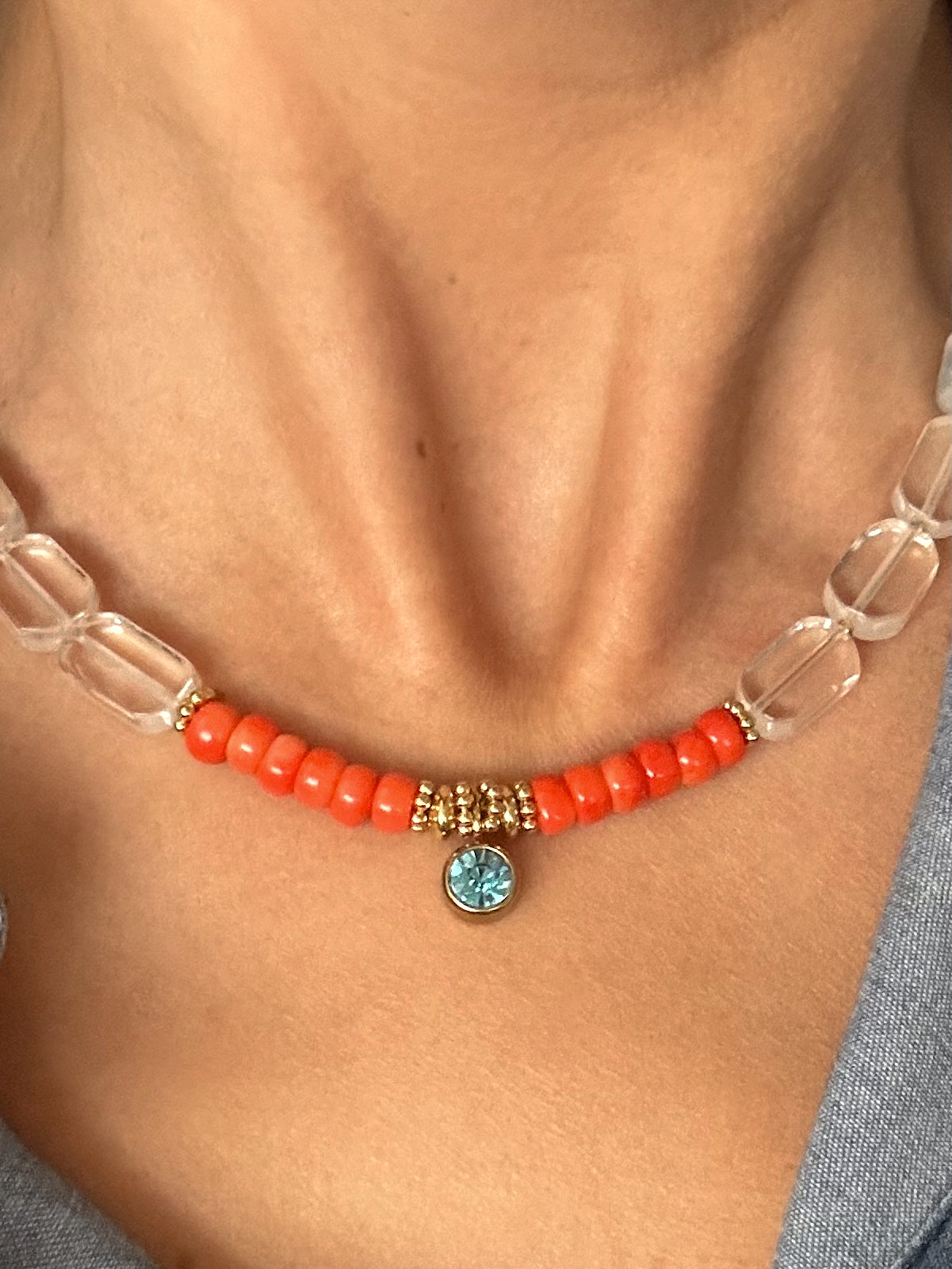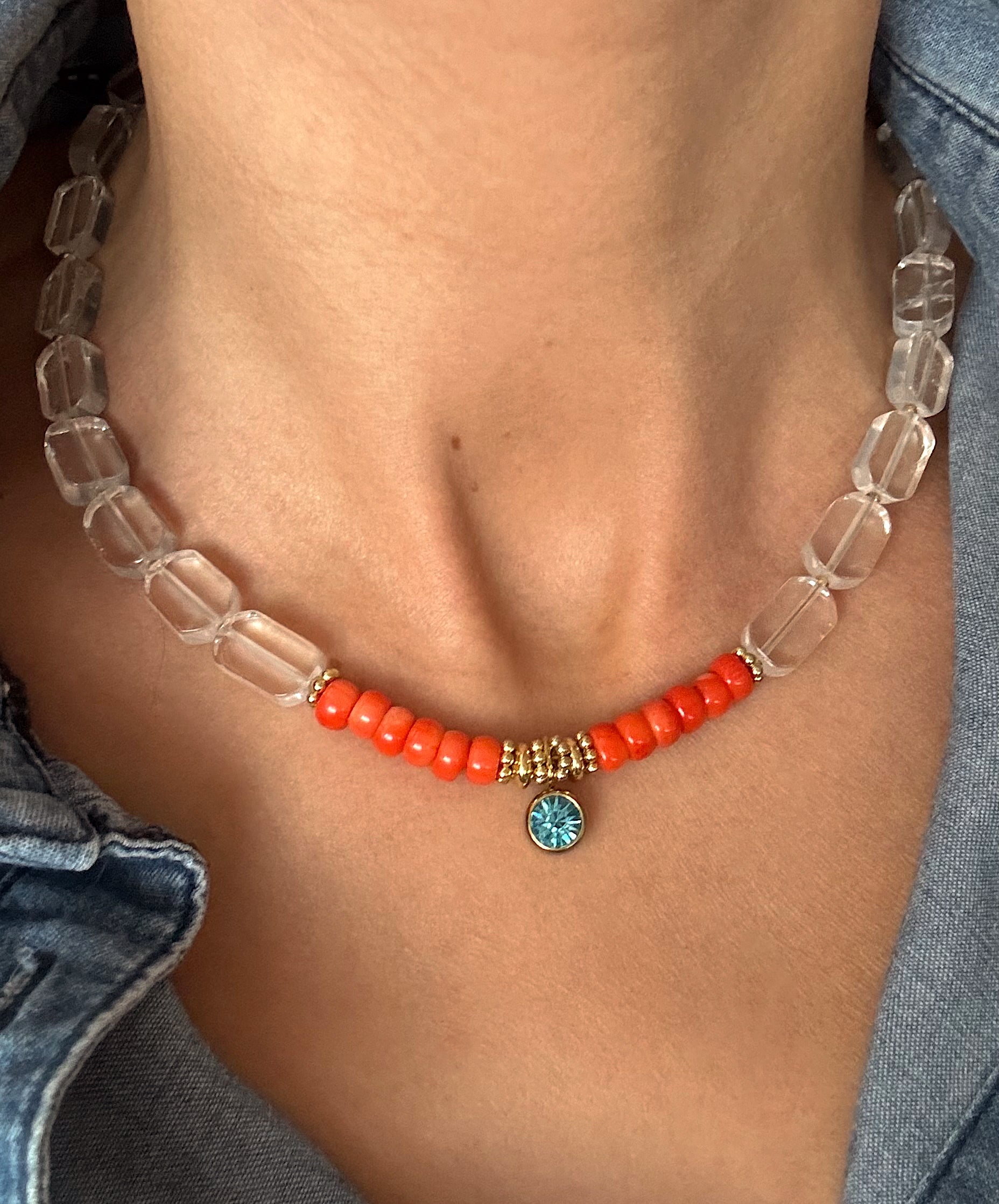 Coral and quartz create a striking harmony, while a flash of blue zirconia adds modern clarity. A necklace that embodies the lightness and strength of high vibration.