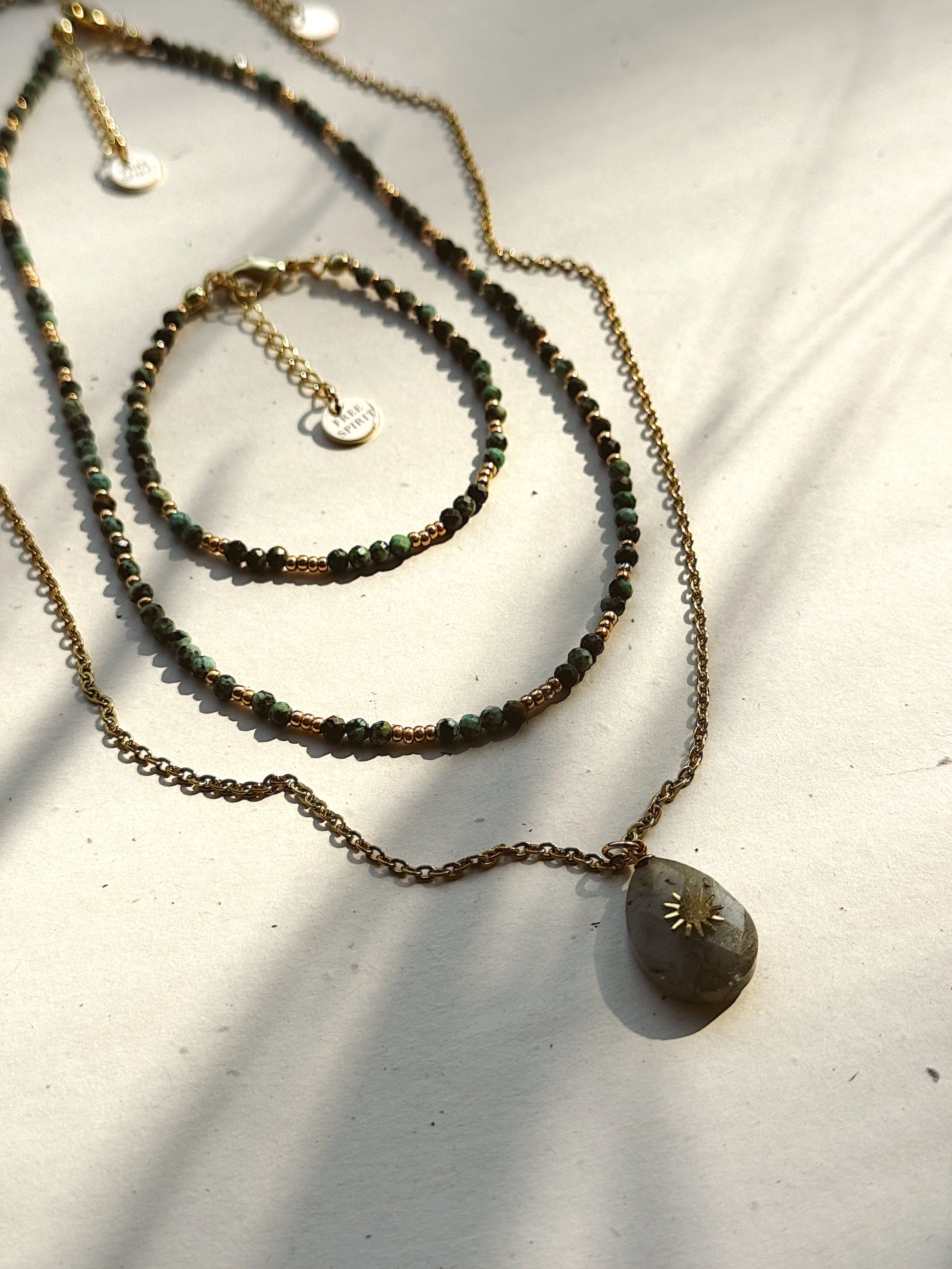 Carrying the energy of African turquoise and Labradorite, it weaves renewal, balance, and transformation into one talisman, grounding yet awakening, created for those who move through life with strength and soul.
