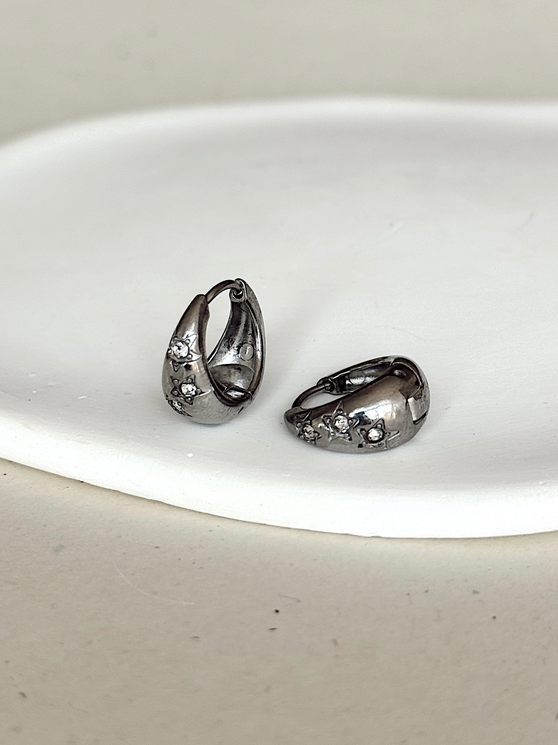 Made from durable stainless steel in sleek silver or old gold plating, each hoop is sprinkled with tiny zirconia stars that shimmer like stardust.